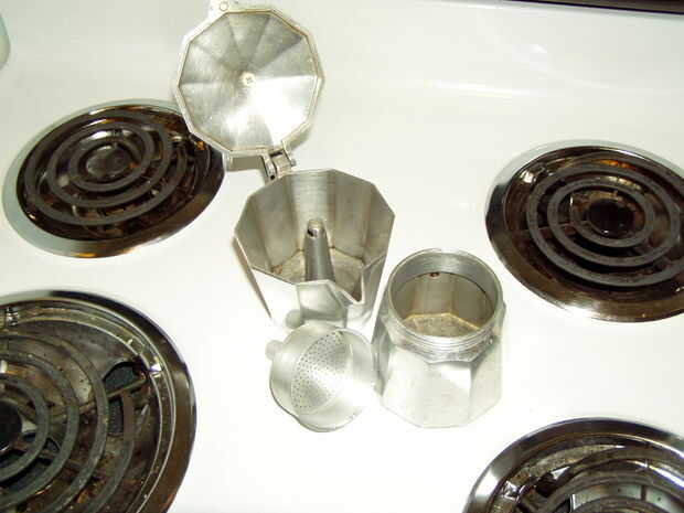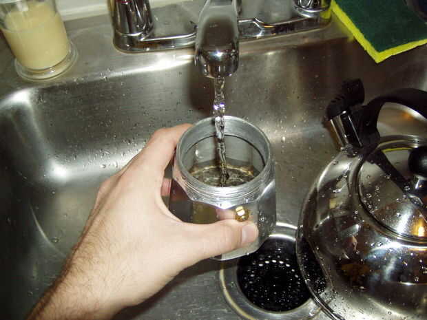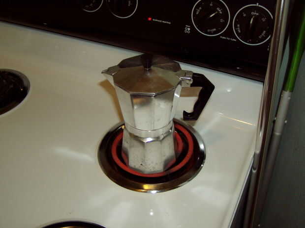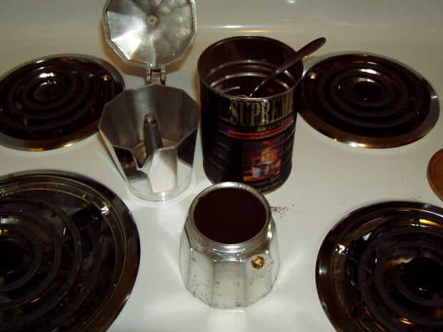 Primero llene la base con agua. Detener justo antes el agujerito de la liberación. (Usted puede verlo en la foto cerca de mi pulgar.) En segundo lugar poner el colador en y se llenan de café espresso. Nivele con la cuchara. Finalmente enroscar firmemente la parte superior y ponerlo en el quemador. (Poner la máquina en el quemador y encienda el quemador. No calor del quemador para arriba y entonces puso la máquina).