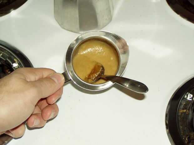 Añadir primero un poco de café al azúcar (es difícil decirte cuánto, porque siempre hacerlo a simple vista, pero creo que sería unas dos o tres cucharaditas de valor). Ahora mezcla el HECK fuera de él. Casi debería verse como una crema espesa cuando termines. Si se mezcla y es todavía clumpy, añadir un poco más café y mezclar más.