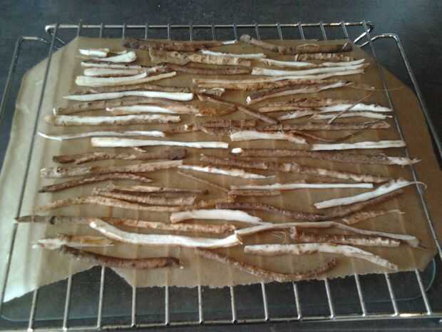 Coloque las raíces en rodajas en el horno durante 1 hora.