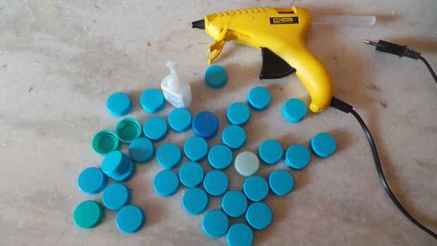 Recoger algunas tapas de botellas de plástico y el calor la pistola encoladora y que ha requerido para hacer este! También puede utilizar pegamento en lugar de pegamento caliente.