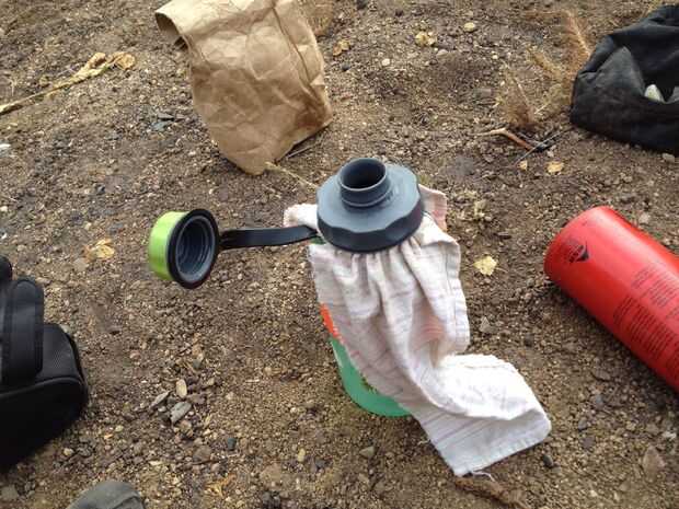 Vierta el café en y vuelva a enroscar la tapa sobre el paño. Tornillo lo suficientemente apretada como para mantener la tela en su lugar pero no demasiado apretado, usted querrá aire para poder escapar cuando estás vertiendo el agua sobre él.