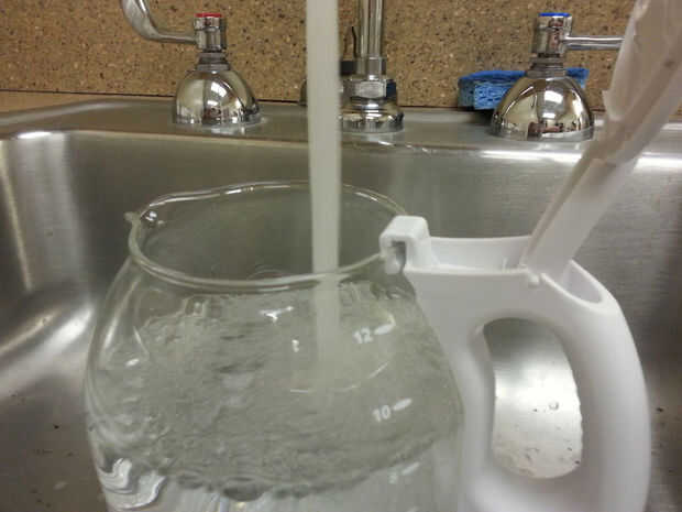 Usando el bote para medir la cantidad de agua agregada, llena la maceta hasta la marca deseada Copa, entonces luego Vierta el agua en el depósito.