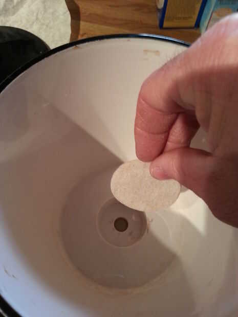 Preparar su sistema de filtrado. Coloque el tapón en el fondo de la olla. Luego coloque el filtro de fieltro en el interior de su sistema como se muestra.