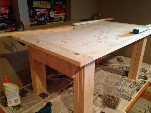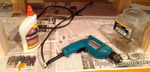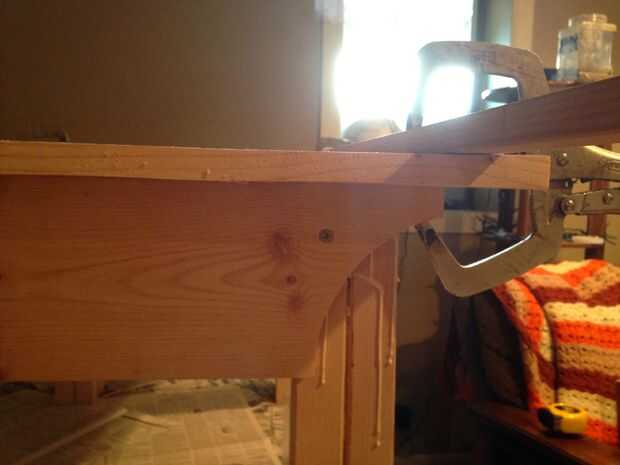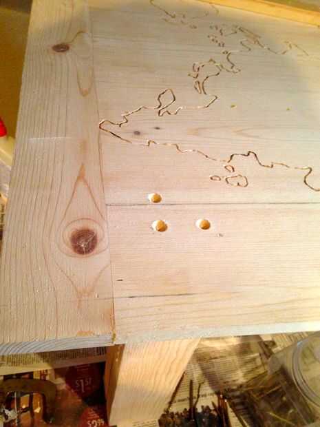 Para terminar de armar la mesa I quitar una pierna a la vez, había cubierto de pegamento y entonces se inserta en su lugar. Con una broca de avellanar perforé tres agujeros en la parte superior de cada pierna, dos agujeros en el interior de la falda detrás de cada pierna y un agujero en la parte exterior de la falda. En lugar de abrazaderas para mantener las piernas en su lugar mientras seca he utilizado tornillos, que mantienen cada pata en su lugar y reunió a toda la tabla. Una vez que el pegamento se seca su mesa está lista para los últimos toques!