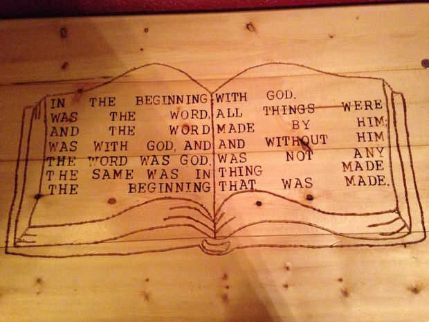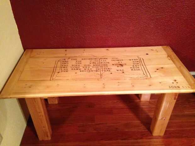 Y finalmente aquí es un diseño de mesa de libro abierto. Me pidieron hacer esta mesa con este verso específico, pero el diseño podría ser adaptado a su presupuesto de libro favorito! Para hacer las letras que usé una carta ardiente apego para la madera quema herramienta, que también se puede comprar cómodamente en Amazon! Para el libro diseño I cuadro de libro abierto solo busqué en Google y allí estaba. El internet es realmente muy aseado!