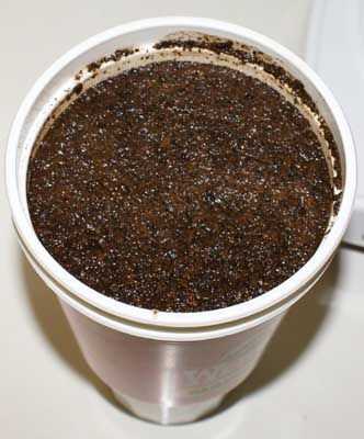 Llene la taza con agua fría y confusión el café con la cuchara de plástico que también recibió en la saca de la ventana. Los motivos van a flotar para el inicio del proceso. una vez bien mezclado y todos los motivos son mojados Colóquese la tapa a la taza y poner en la nevera. Lavar la cuchara y limpiar el mostrador.