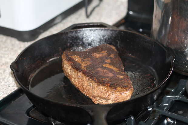 Una vez que la sartén esté bien caliente, vierta una cucharada de aceite (yo prefiero aceite) e inmediatamente ponga la punta de la tri en la sartén caliente. Déjelo dorar dos minutos o hasta que es agradable y marrón a cada lado. Debe oír mucho que chisporrotea y crepitante. Si no lo hace el pan no es lo suficientemente caliente. Ya se cocina la carne antes de que entre en la bandeja, así que este paso es sólo para asegurar una buena corteza y resaltar más el sabor de la frotación.