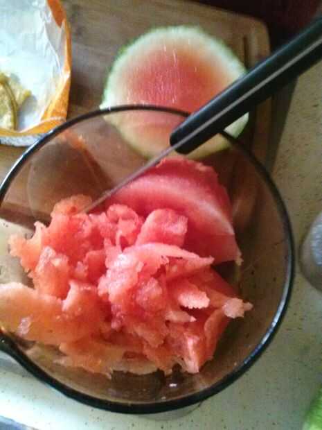 En segundo lugar se llevo a cabo la pulpa de la sandía y coloca en un recipiente en el lado y tajado para arriba en pequeños pedazos. Esto va a ser parte del relleno dentro de la sandía junto con el café.
