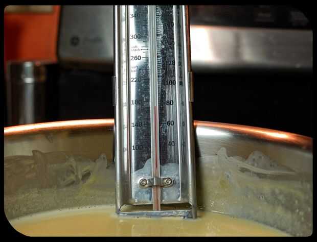 Vierta la mezcla en una cacerola sobre fuego medio-bajo y cocine, removiendo frecuentemente, hasta que llegue a 170° F temperatura de la crema (natillas está lista un dedo pasa a través de la parte posterior de una cuchara deja una línea limpia).
