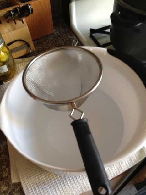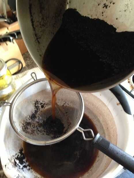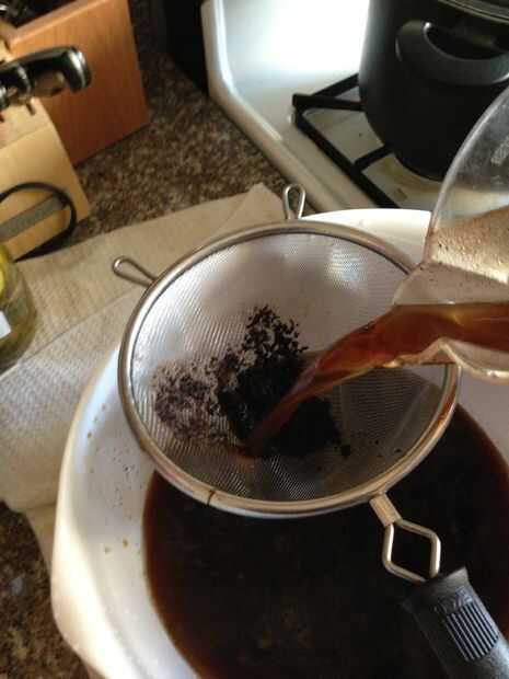 Esta parte de bastante fácil. Vierta el café por un colador (Vierta en un tazón grande con una boquilla, que luego utilizo para verter en la jarra de mi. Usted podría verter directamente en una jarra, si eso es lo que vas a utilizar). f se utiliza café molido grueso como te dije que esto debería ser suficiente. Si fueron tontos y utilizar cualquier suelo fino o café molido, puede añadir una capa o dos de cañamazo a su filtro. El recinto pasó hace compost excelente.