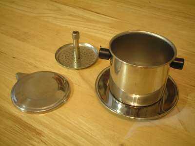 Esto es una olla de prensa vietnamita-syle. Este pequeño dispositivo sola porción pretende montar en una taza, mantenga unas dos cucharadas vale la pena de café y la cantidad necesaria de agua para la elaboración de la cerveza. Hay una pantalla en la parte inferior y un émbolo con otra pantalla en él que tornillos abajo en la parte superior del café a ensuciarse lo entre los dos filtros. La estrechez de este filtro controla la fuerza del café. Más apretado es el agua fluye más lento y más fuerte la cerveza. Estos dispositivos están disponibles en el mercado asiático. Si usted tiene una opción, mercados del sudeste asiáticos están más probables que esta variedad de la olla de la prensa, a pesar de la clase más común de 'Supermercado Chino' del mercado a menudo llevarán tal un instrumento. Puede ser tenidos por unos dólares. Obtener al menos dos, preferiblemente cuatro.