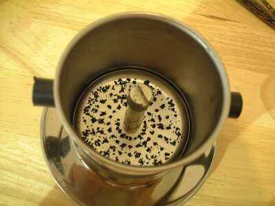 Atornillar el elemento de filtro en el bote. Si no puede conseguir los hilos para participar, usted puede han puesto en un poquito demasiado café. Esto es donde elegir qué tan fuerte es el café. Más = más lento pero la cerveza más fuerte, más flojo = más rápido pero más débil preparación. Personalmente, me gusta mi café a venir hacia fuera tan negro luz sí mismo no puedo escapar de su superficie. Girar abajo bastante fuerte, no tan duro que tengo que utilizar herramientas o conseguir una ampolla, pero un buen apretón. En caso de duda, hacer un poco en la parte estrecha. Usted puede siempre aflojar (usando el mango de la cuchara como un destornillador) durante la infusión si desea acelerar las cosas un poco, pero obtendrá un colado insatisfactorio si su no apretado lo suficiente y sólo drena a través. Desea que este café sea más fuerte que habituales saliendo de la olla porque se están diluyendo con la leche condensada y el hielo que se va a agregar. Además, se trata de ningún café débil-culo oficina que estamos haciendo, este es el verdadero negocio.