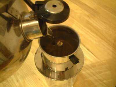 Añadir agua hasta la tippy-tapa de la olla, pero tenga cuidado de no derramar en ti mismo. Después de haber vertido en el agua, ponga la tapa en la parte superior para sellar en el calor y dejarlo ir. Si está utilizando motivos frescos, podría obtener algunos 'floración' espumar encima (esto es debido al CO2 en granos recién tostados). No se preocupe por él, lo peor que sucederá es que usted tendrá que limpiar alguna espuma.