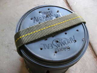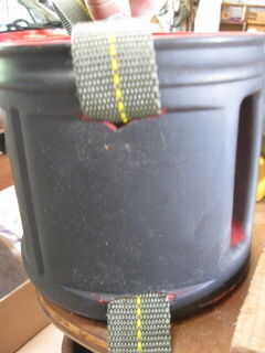 Pintar la lata si quieres y dejar secar totalmente. Corte dos ranuras horizontales por un lado de la lata, aproximadamente 1/4" de más de la correa es ancha. Corte dos más en el lado opuesto. La correa a través de las ranuras de alimentación como se muestra arriba, teniendo en cuenta que será la hebilla en la parte inferior de la lata.