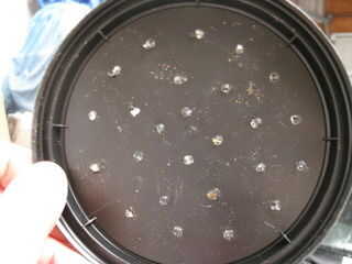 Retire la tapa y Voltéela boca abajo en un pedazo de madera de desecho. Taladre orificios 3/4" -1" aparte. Puede que necesite pasar un rato quitar el plástico poco "colas" de cada agujero con una pinzas y navaja X-acto. Un agujero de 3/16" trabaja para Preen, un herbicida comercial.