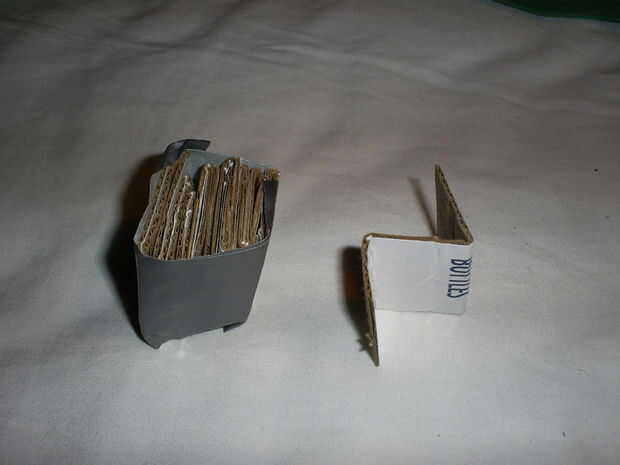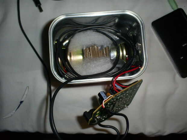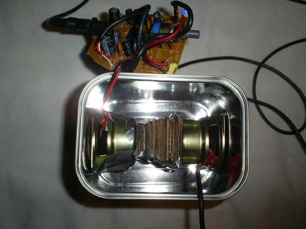 puse el altavoz en la parte inferior de la lata mirar hacia afuera. Dobla el cartón y pato grabado juntos para hacer un separador para que los altavoces serían permanecer en el lugar. Luego le puse en la espuma de los altavoces viejos para actuar como un amortiguador.