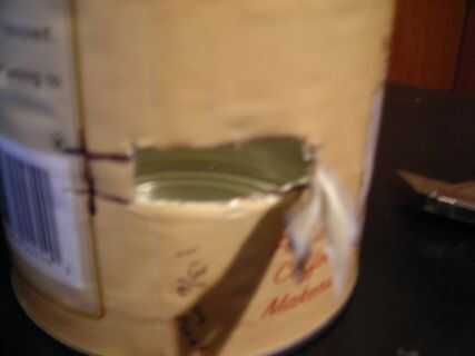 No me preguntes por qué dejó la etiqueta en la lata, tampoco. Puedes ver al final que sólo rodé el agujero abierto en el lado derecho al tamaño necesario. Aplanó los puntos enrollados poniendo la la lata en el espacio de trabajo y aprovechando el interior de la can.