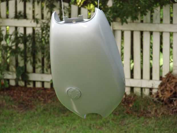 Finalmente, después de pasar más tiempo del que usted pudo haber pensado alguna vez posible con este tanque de gas simple, no termines todavía! Que necesita para proteger su trabajo de pintura con una capa transparente. Es fundamental que la capa clara ser resistente a la gasolina. De hecho, escogí todas las capas de pintura para ser resistente a la gasolina. No está hecho todavía. Después de la capa transparente ha curado, ahora toca pasar horas más laboriosos lijado húmedo de la superficie. Utilice papel de lija de grano 1000 para sacar lo peor de la piel de naranja en la superficie y trabajar su camino hasta grano 2000. Luego use un compuesto para restaurar el brillo a la superficie de pulido. Ahora que terminaste pintura!