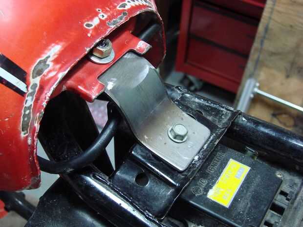 La forma del tanque Nighthawk es muy diferente al tanque CB350. Un soporte fue requerido para montar el tanque CB350 al marco de la Nighthawk. El soporte es una pieza de 1/8" soldable de acero que ha sido doblado en forma de una curva de s relajada. La altura fue elegida para que la parte inferior del tanque habían limpiado el motor por una pequeña cantidad. Hay no hay medida exacta para esto - ensayo y error con un pedazo de cartón se metió las partes en la zona derecha y el metal estaba doblado por consiguiente. Tratar de calentar el metal para hacerlo más fácil doblar pero no fui capaz de obtener el metal lo suficientemente caliente con el soplete de propano. En cualquier caso, 1/8 metal es "fácil" a la curva en un tornillo de banco con apoyo apropiado de un martillo de 3lb.