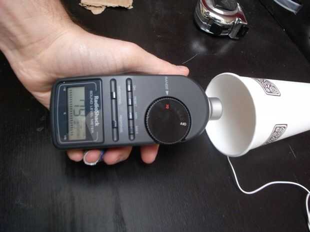 La primera prueba que hice fue poner el medidor en la boca de la Copa. Comparé esta lectura con una medida del volumen desde el otro auricular a la misma distancia. La altura de la taza era unos 5" así que medí el auricular de 5", así.