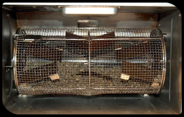 Cargar el tambor en el asador. Asegúrese de que se asiente correctamente antes de continuar. Por último, coloque el selector de desperdicio en el asador para colillas contra la parte inferior y delantera del tambor.