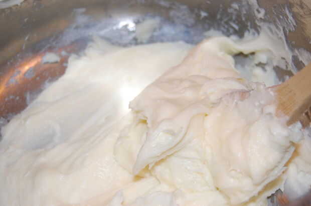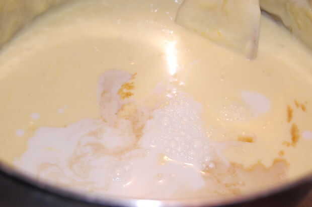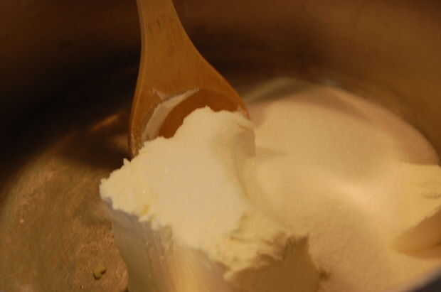 Tratar el relleno como si fuera una masa de torta. Crema el queso crema y el blanco de azúcar primero, o bien no conseguirá nunca el queso crema todos incorporado. Añadir los huevos uno por uno. Mezcla la crema agria y harina, para impedir el amontonamiento de la harina. Añadimos a la masa, junto con la leche, vainilla y sal.