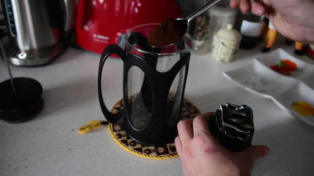 Para hacer el café, todo lo que tienes que hacer es vierta café gruesamente en la prensa (yo uso 2 cucharadas), llenarlo con agua hirviendo, cubra la prensa con la tapa (sin presionar el émbolo hacia abajo), deje empinada por lo menos 4 minutos, presione el émbolo hacia abajo y vierta.