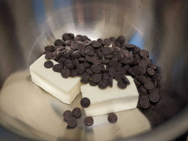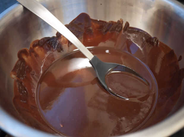 Coloque el segundo recipiente sobre una olla de hervir agua y remover hasta que se derrita. ¿El cuadro aquí con los palillos de la mantequilla? Totalmente equivocado. Picar en un menor tiempo de torta.