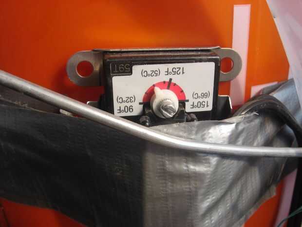 Me encontré con un termostato de agua caliente eléctrico, bajo calefacción de la bobina, en Home Depot en menores $9.00. Apliqué el litio grasa alta temp, blanco, para el área de contacto y pegadas al cubo. Pensé que esto ayudaría a hacer una mejor superficie de contacto. No necesito cortar el cubo. Tomé una pierna de la cuerda del calentador y cortar entonces alambré en el termostato. Entonces pato con cinta al cubo. No había necesidad para montar cualquier cosa dentro de la cubeta. No soy capaz de ajustar el termostato a una temperatura de ajuste. Soy capaz de utilizarlo para llegar a mi temperatura deseada y para mantener esa temperatura. Después de esta foto que descubrí que está boca abajo. En esta configuración estoy seguro que usted podría conseguir 5 galones de agua caliente a 180 grados tal vez mayores en tiempo de 2 horas.