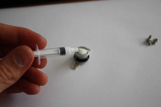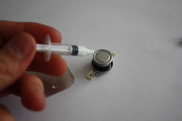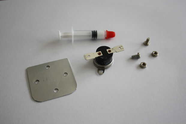 El elemento de calefacción ordené tiene una pequeña pieza soldada a él donde puede fijar el termostato. Corté un pedazo de aluminio para esto. En esta pieza va más adelante también es posible conectar la tierra de seguridad. Para asegurarse de que el calor es transferido bien al termostato utilicé pasta térmica entre la conexión de las piezas de aluminio, el elemento calefactor y el termostato.