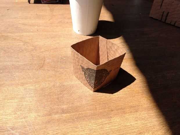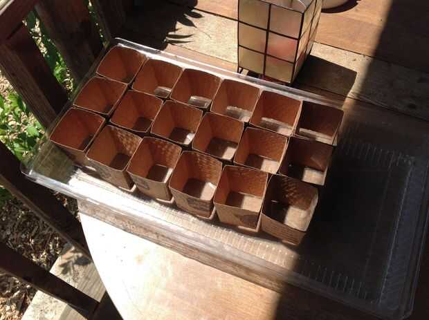 Que dobla las mangas y los cuadrados. Macetas cuadradas caben juntos haciéndolo más fácil verter el macetas, además de ahorrar algo de espacio. Ahora colocarlos en una bandeja que retiene el agua, utilicé la tapa de una vieja bandeja de arranque plántula.