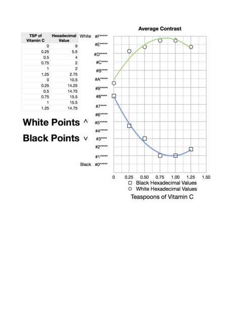Había expuesto seis rollos de película con tiros de un blanco y negro cuadro de escala de grises. Desarrollé una sin vitamina C (imagen #1), uno con 1/4 cucharadita (imagen #2), uno con 1/2 cucharadita (imagen #3), uno con 3/4 de cucharadita (imagen #4), uno con 1 cucharadita (imagen #5) y uno con 5/4 cucharaditas (imagen #6). Para medir el contraste de las imágenes finales, recortada en trozos (imagen #7) de cada sección negro y cada sección blanca de los conjuntos y luego trató de promedio de la sombra y valoran su hexagonal con whatsitscolor.com. No puede haber sido el método más eficiente, pero terminó con un gráfico (imagen #8) que tiene sentido.