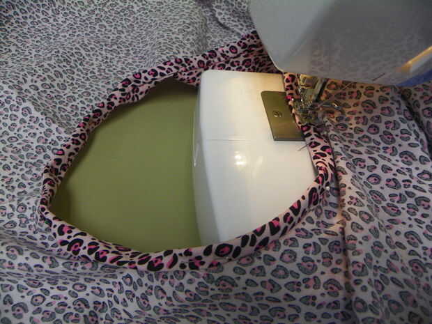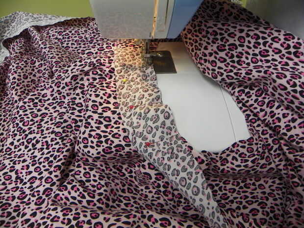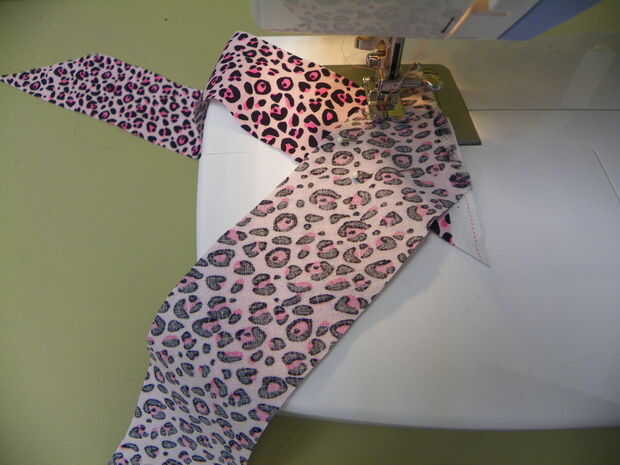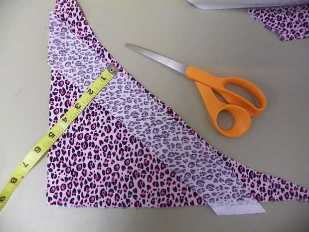 Tomar las piezas se cortan de las esquinas inferiores y diagonal cortan 3 tiras de 2" de ancho. Coserlos extremos hasta que haya una franja de unos 32" de largo. Prender esta tira derecho lados juntos a la abertura del cuello y coser con 1/4 costura todo alrededor. Se traslapan aproximadamente 1". Corte el exceso. Baje hacia el interior de la prenda y doblar otra vez. Prender la vista todo alrededor de la abertura del cuello. Coser con la máquina de coser o costura de la mano.