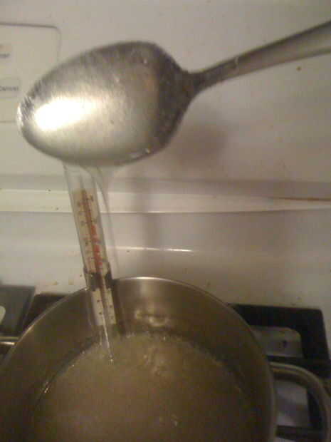 Calentar el azúcar y el azúcar de maíz hasta que el termómetro lee entre 295F y 300F. Etapa dura crack.  Si te dejas caer en agua fría se forman hilos frágiles y hacer un agrietamiento sonido.  Que es divertido hacerlo y usted puede hacer de esa manera si no tienes un termómetro de caramelo.
