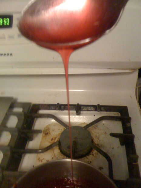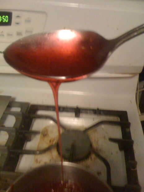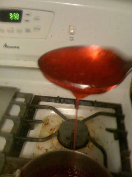Salpicar el jarabe sobre las cacerolas de la mantequilla.  Cuidado! ¡ PRECAUCIÓN! Caliente muy caliente líquido pegajoso!