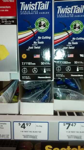 8 - ataduras de cremallera. Compré el TwistTail de Thomas & Betts porque son temperatura nominal de menos de 40 F-precio diario es $4,97. Dudo que la longevidad de los estándar dólar tienda zip-lazos debido a la temperatura de congelación. El tiempo dirá a estos duración sin agrietarse aparte. Son muy flexibles. También jugó con la idea de gratis lazos de torcedura verdes de los productos sección en ralphs – sonidos como "ible" como estos, pero bueno, estaba ya en Lowes.