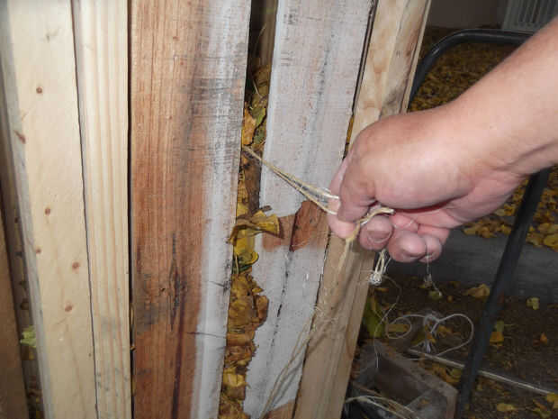 Libere los extremos de la cuerda y pasar sobre las hojas (sin el émbolo), así que ambos proyecto de extremos de una ranura en el lado de la prensa. (Esto tiene sentido en la imagen) Hacer esto para cada una de las tres piezas de hilo de enfardar.