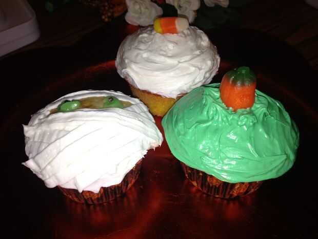 Hornear mezcla para pastel según la caja, a continuación, deje que se enfríe. Decorar la momia con vainilla formación de hielo en una bolsa de decorador de torta con punta plana, y utilicé un gomoso corte por la mitad para los ojos. El otro cupcake es verde teñido de glaseado con una calabaza de dulces en la parte superior.