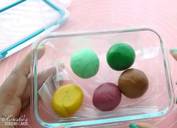5 o 6 tonos de fondant: Borgoña, verde, verde claro, marrón, amarillo y también ha añadido naranja.