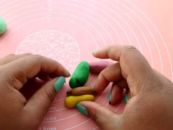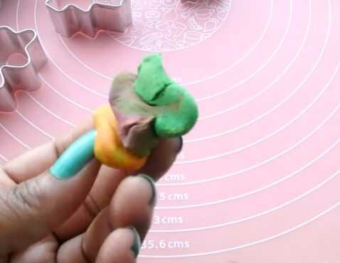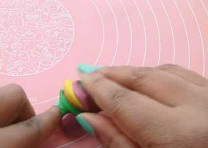 Combinar las piezas de fondant y amasar hasta que se han combinado los colores a tu gusto. Recuerda no hacer demasiado el fondant, desea poder ver cada uno de los colores que se agregaron.