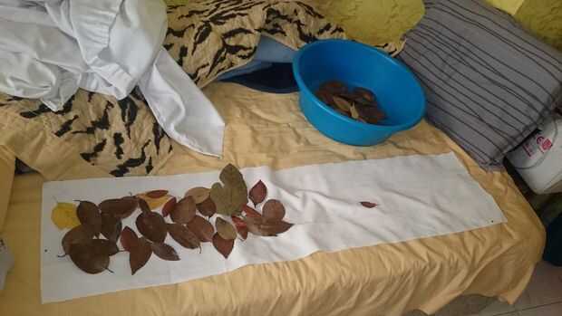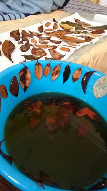 Para mantener las hojas secas como son, busqué en internet y subió con una solución. Es glicerina. Mantiene hojas suaves y vivos. Existen diferentes métodos para utilizar glicerina, supongo que también depende de que tipo de hoja que utilizas. Pero al final, con cambios menores de color, me las arreglé para conseguir lo que quería.