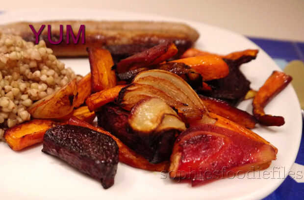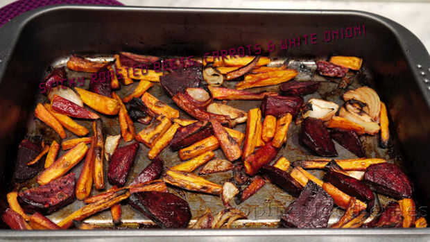 1. Precaliente el horno a 200° C (400 F) por 10 minutos. En una gran lata asar antiadherente, coloque su remolacha, zanahoria tiras y cuñas de cebollas blancas, 1 capa en. Esparza su pimienta negra, sal de mar sobre sus verduras. Vierta el vinagre de frambuesa y vinagre balsámico todo tus verduras y con guantes de plástico sobre todo se mezclan juntos. Coloque en su horno caliente y asar por unos 25-30 minutos hasta que la verduras son cocidas. Entregar tus verduras después de 15 minutos, para evitar que se queme y para un asado igual!