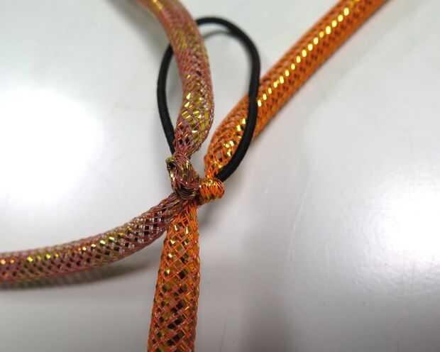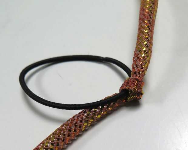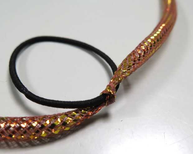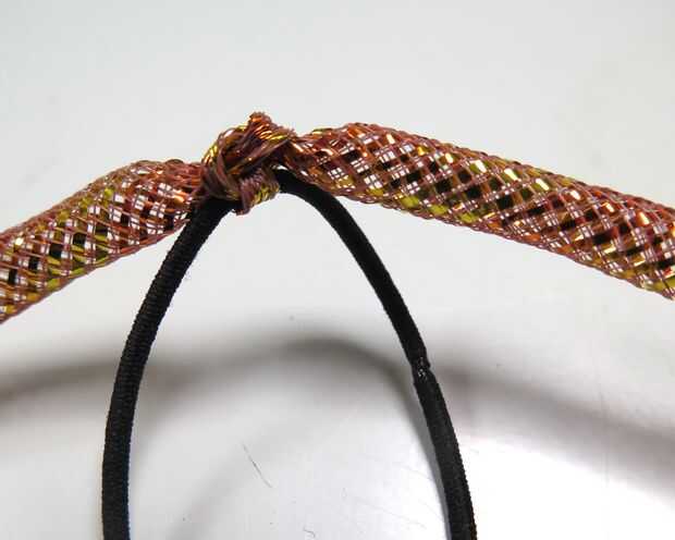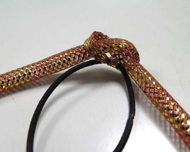 Una vez finalizados todos los extremos de las longitudes de los tubos de malla, empezar a atar en su banda de cabello con nudos dobles. La tubería de la malla se comprimirá mucho así que usted puede atarlos muy bien. Tratar de amarrar la malla a la venda del pelo como cerca del centro de la longitud de la tubería como sea posible para que tu cabello sea una longitud uniforme. O ate del centro para conseguir un efecto de capas!