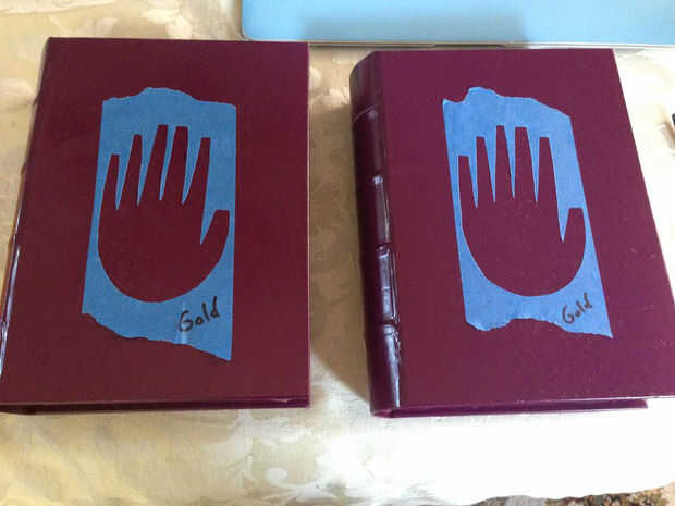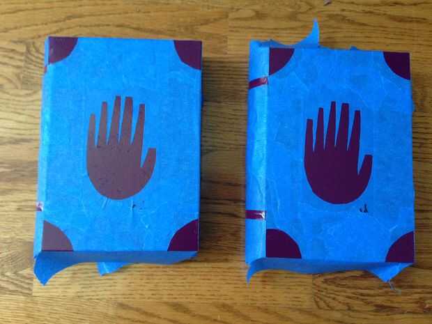 Apliqué una amplia banda de cinta de pintor a una hoja de papel encerado y luego encolar el recorte de la mano. Utilizando una cuchilla afilada, corta la mano y dejaron atrás un poco de cinta de pintor con un hueco en forma de mano. Apliqué esto a la revista. A continuación, usé cinta de pintor más a todo lo demás en la cubierta de la excepción de las esquinas de oro. Cortar cada uno de ellos individualmente en lugar de como curvas idénticas... Creo que presta más a la apariencia de dibujos animada dibujados a mano de la cubierta final. No olviden las dos barras de oro a través de la espina dorsal del libro.