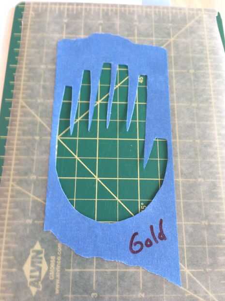 Cuando empecé a pensar sobre este proyecto, consideré imprimir ciertos elementos como etiquetas engomadas y aplicarlas al libro. Si tienes a niños, sin embargo, sabes que no duran pegatinas. Te pela o raspa y rasguñados para arriba. Decidí ir con una revista completamente pintada para todas las funciones, así que había ampliada una imagen (de images.google.com) de la mano (seis dedos!) y ajustar el tamaño e imprime unas impresiones de prueba hasta que estaba satisfecho con el tamaño. Corté dos manos (de cada revista). La primera me permitiría el oro que forma de la mano la pintura. La segunda se utilizará para pintar el número de la revista (1 y 3 fueron los números que elegí).