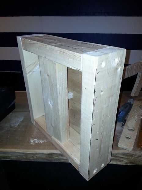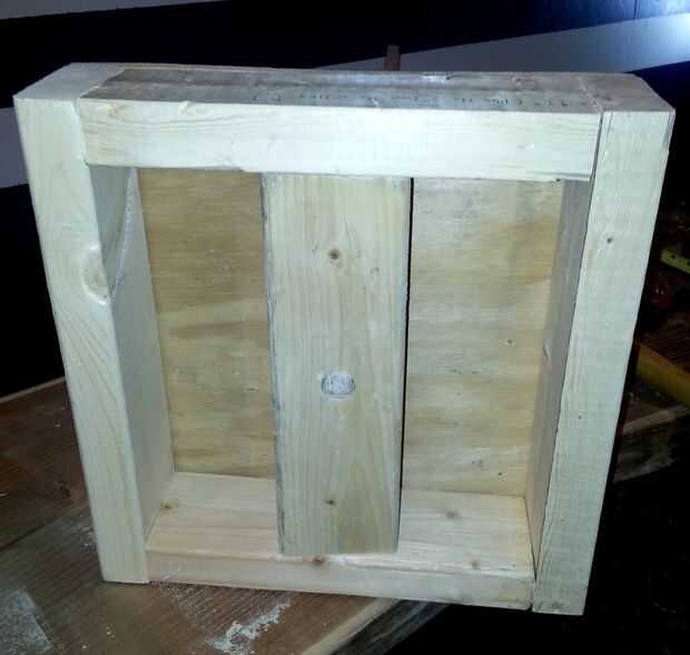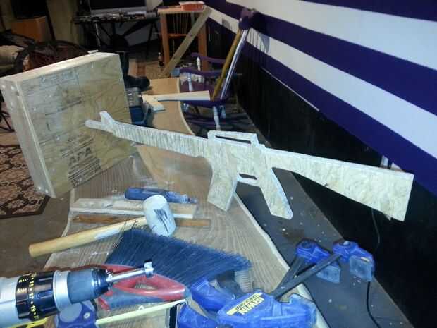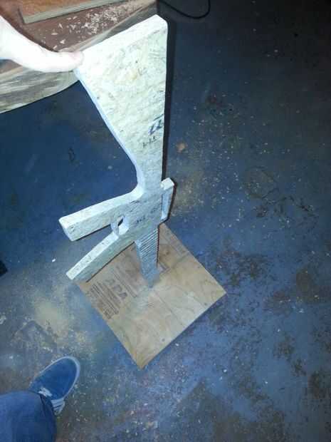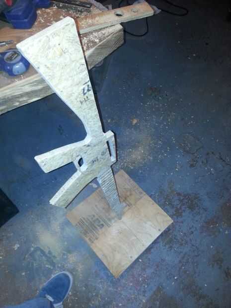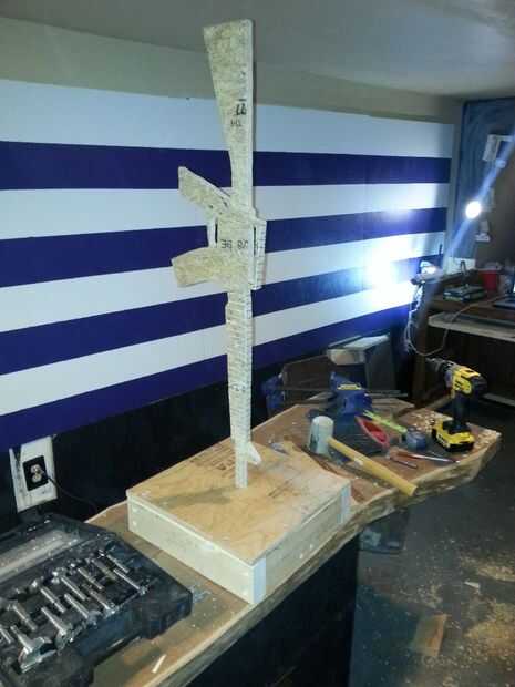 A continuación tomar más repuesto 2 x 4 y cortar una pieza que (con un poco de goma mazo TLC) se ajusta entre los 2 lados de la parte inferior como se muestra en la imagen. Encontrar el centro exacto de la 2 x 4 en la parte inferior y el agujero del mismo tamaño como es en la parte superior de la corte. Esto le dará mucha estabilidad para el arma cuando está de pie.