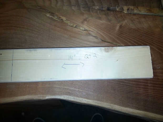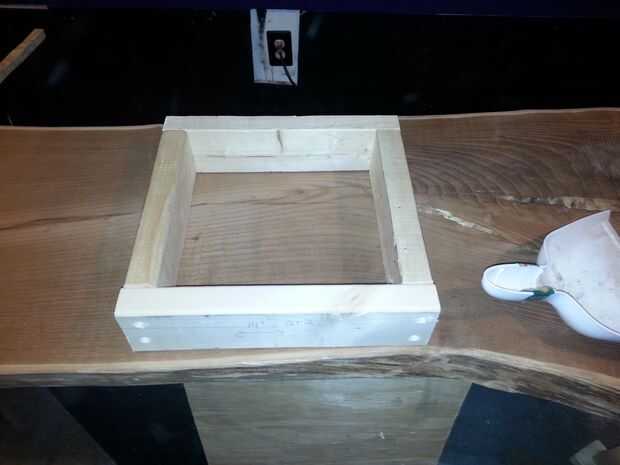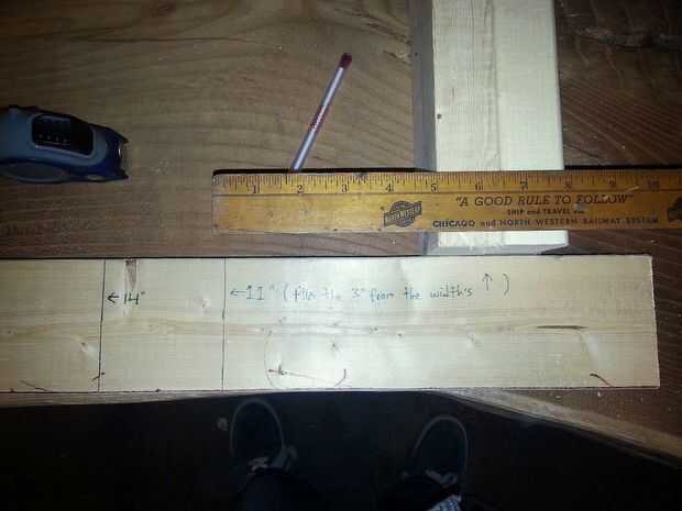 Mis botas eran aproximadamente 11" de largo, así que hice mi caja de 14"x 14". Recuerde, sólo tiene que cortar la primera 2 x 4 a la longitud de 14", luego al colocar las entre los 14"s tiene bajo-compensar el ancho del 2 x 4.