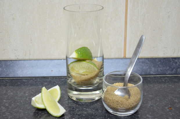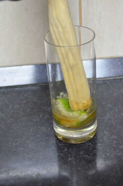 1. Coloque 3-4 rodajas de limón (medio limón) y las 2 cucharaditas de azúcar en le vaso.