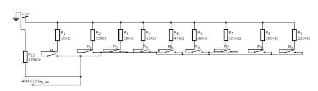 Tienes que conectar varias resistencias con valores distintos en paralelo el los + 5V, luego el botón, luego hilo el botón con el conector analógico.