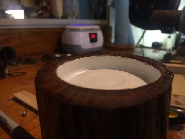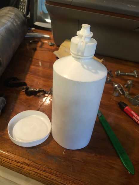 Fui en busca de una botella que fue 2.5" ancho y encontró que un equate"visine"botella (disponible en Walmart) ajustarse perfectamente suficiente que nada era necesario para asegurar la botella a la caja. Cortar la botella de. 5" desde el fondo y perforó un agujero de 1" de diámetro sobre la posición del motor. Luego pinté este fieltro pieza negro y asegurado en la parte inferior con pegamento elmers.